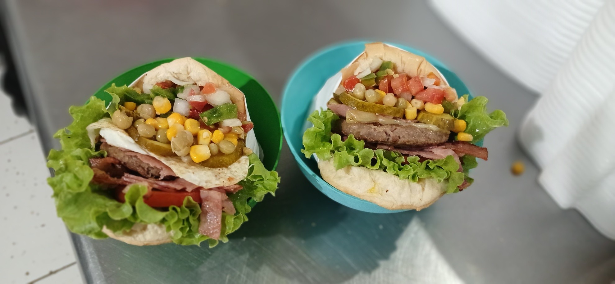 Salada, Presunto, Queijo, Hamburguer, Pão, Ervilha, Milho, Vinagrete, Alface, Tomate, Pepino
