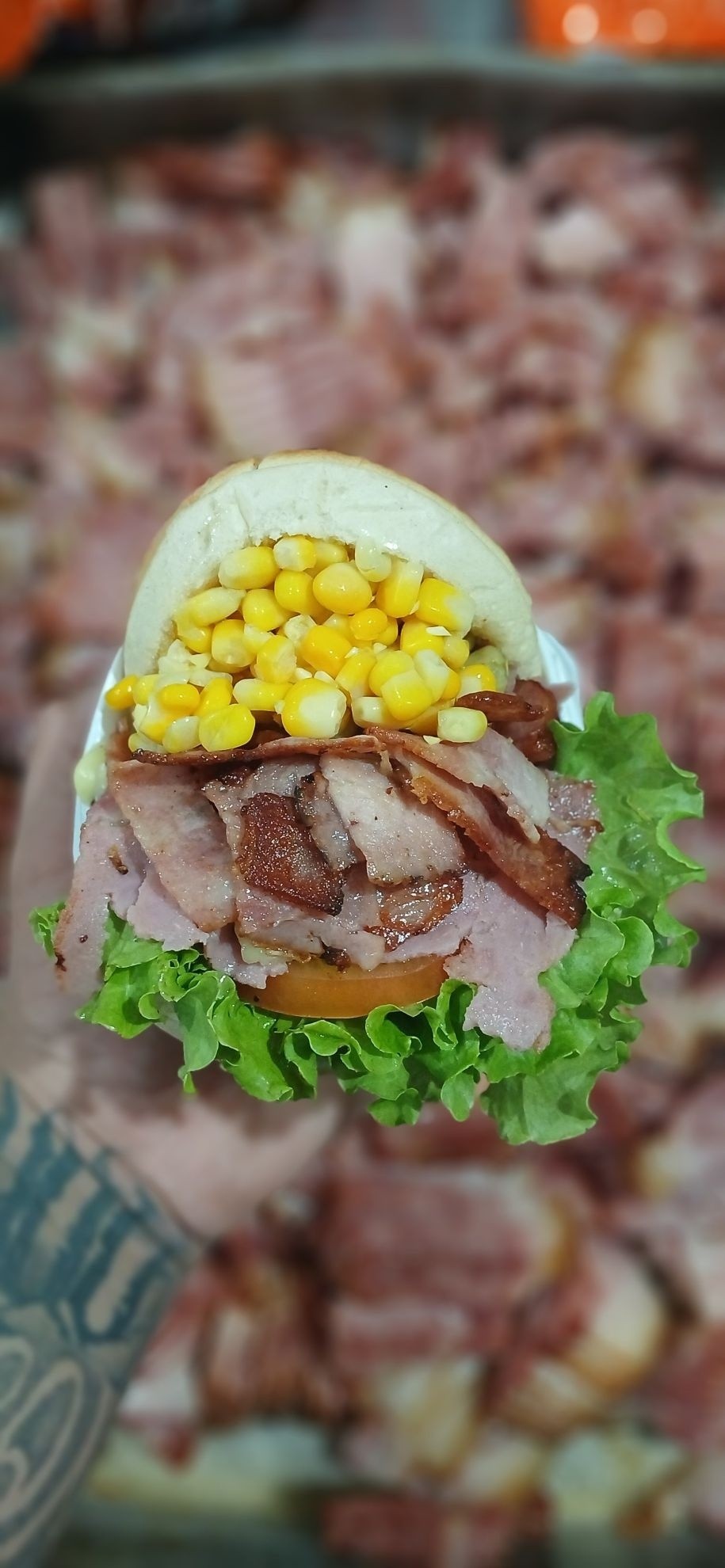 Milho, Presunto, Queijo, Bacon, Hamburguer, Pão, Ervilha, Vinagrete, Pepino, Tomate, Alface, Salada