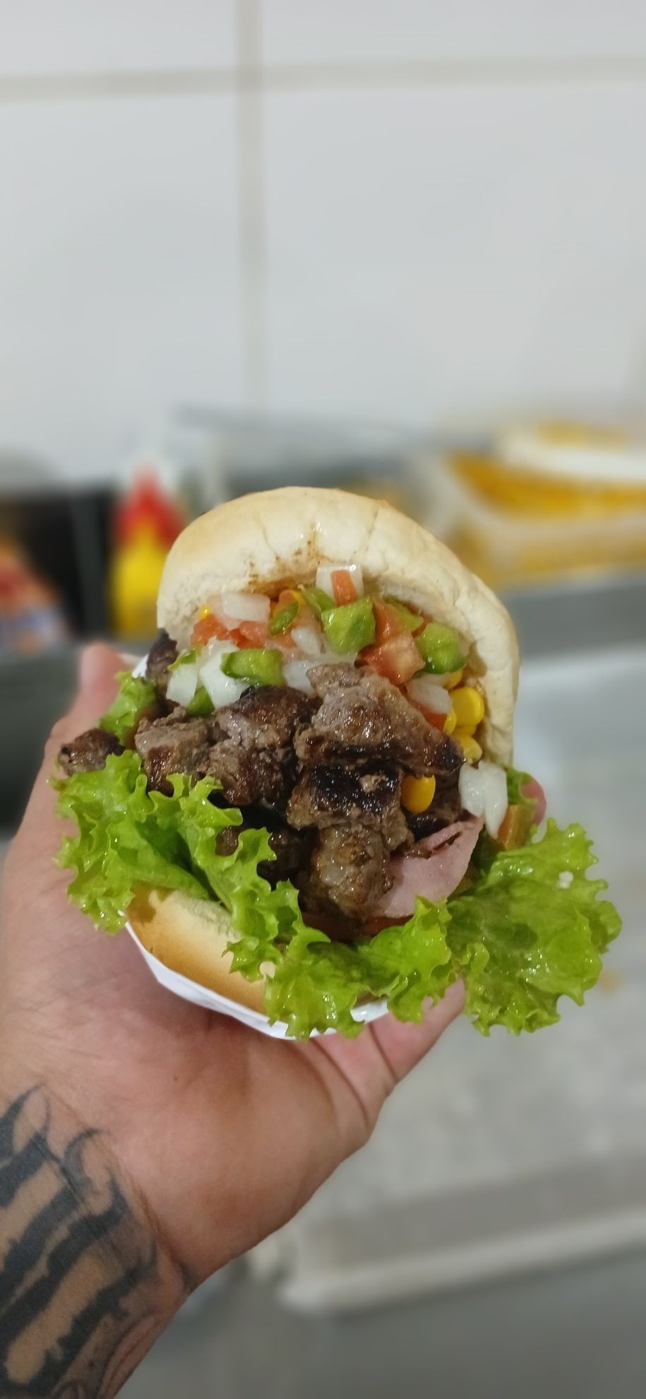 Salada, Presunto, Queijo, Alcatra, Pão, Vinagrete, Milho, Ervilha, Alface, Tomate, Pepino